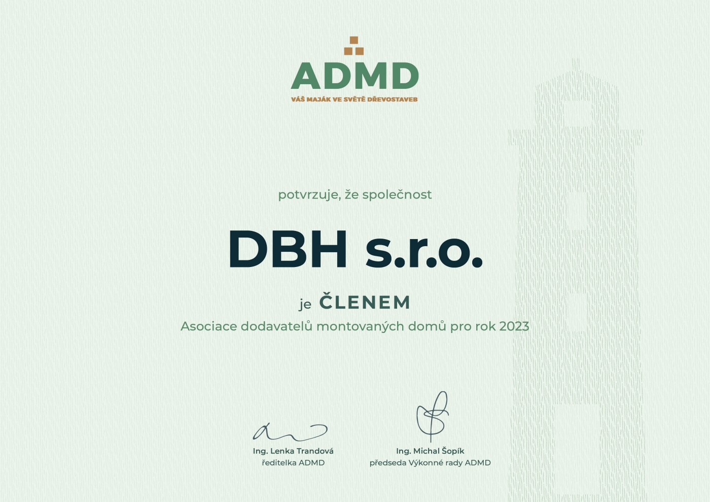 Naše firma specializující se na realizace dřevostaveb se stala 28.3.2014 partnerem Asociace dodavatelů montovaných domů. ADMD je nevládním zájmový sdružením výrobců a dodavatelů, zaměřujících se na montované objekty bytové a občanské vybavenosti na bázi dřeva. Členství v ADMD dává našim budoucím zákazníkům jistotu, že realizace výstavby dřevostaveb probíhá v souladu s požadavky nepovinné certifikace dle Dokumentu národní kvality (DNK). Ta má přísnější kritéria na hodnocení kvality výroby a montáž dřevostaveb, než certifikace zákonná. Díky tomu je tak na dodavetele dřevostaveb vytvářen tlak neustále zlepšovat parametry a kvalitu staveb.