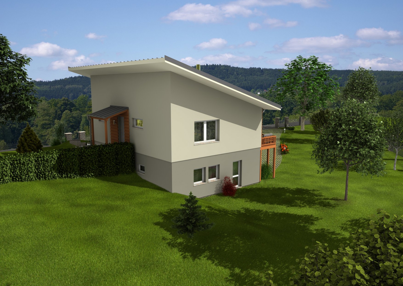 Náš první zrealizovaný pasivní dům. Majitel byl technik z oboru a podílel se na výstavbě Ještědu a byl tedy velmi náročný na technické provedení, projekt dřevostavby si celý vymyslel a nakreslil sám a nechal si ho pouze autorizovat. Přál si na důchod opustit panelákový byt a přestěhovat se do přírody a postavit tak dům, který bude přísně v jejím souladu. Vzhledem ke svažitosti a složitosti pozemku byl dům částečně podsklepen a ve výšce obývacího pokoje tak vznikl "balkon" tj. prostorná terasa s výhledem do zahrady a okolní přírody.