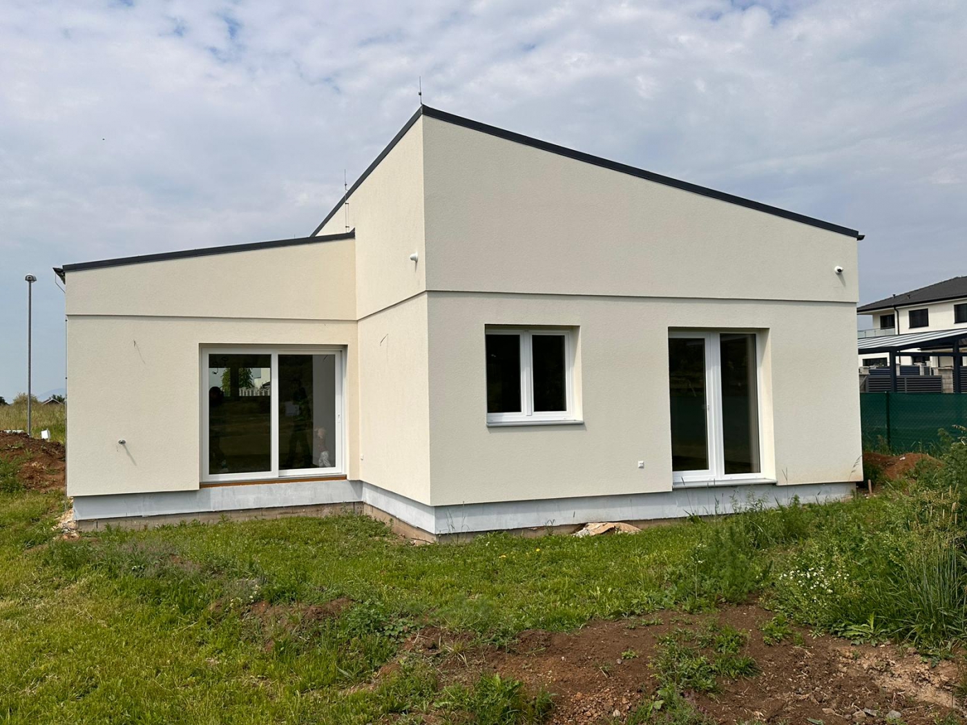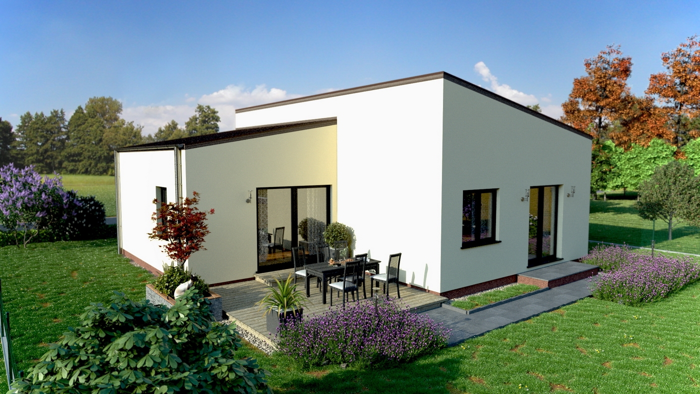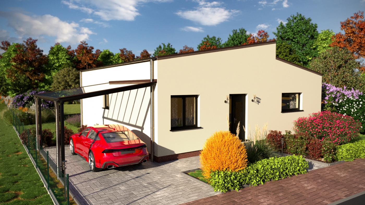 Bungalov, který byl zrealizován pro čtyřčlenou rodinu v nové zástavbě v Ústí nad Labem, Skorotice. Půdorys domu vychází z našeho oblíbeného a několikrát postaveného bungalovu Mayo 120 m2. Zákazníci si přáli dodat domu moderní a neotřelý vzhled, byla tedy vyprojektována atypická pultová střecha. Dům má přípravu pro lokální rekuperaci.