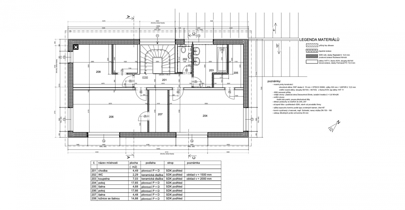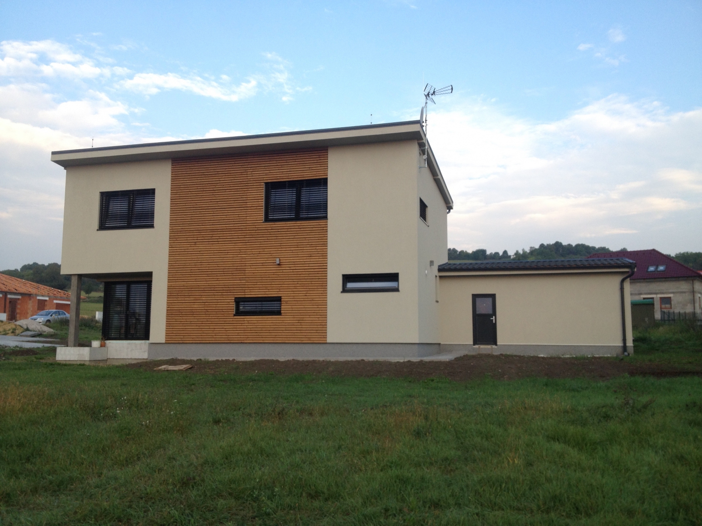 Dvoupatrová dřevostavba v moderním stylu má atypický vzhled a na konstrukční řešení náročný prosklený roh do hlavní obývací části. Zákazníci si potrpí na čistý a jednoduchý design. Objednávalo se např. kovové schodiště na míru, které tvoří jeden z výrazných prvků prvního podlaží. Moderní vzhled dřevostavby zvenku určuje pultová střecha. Dřevostavba má fasádu v kombinaci s dřevoobkladem. Na dřevostavbu pak navazuje prostorná garáž, kterou si zákazníci přáli zároveň používat jako malou dílnu, část garáže je tedy oddělená zateplená a je do ní přivedena voda.