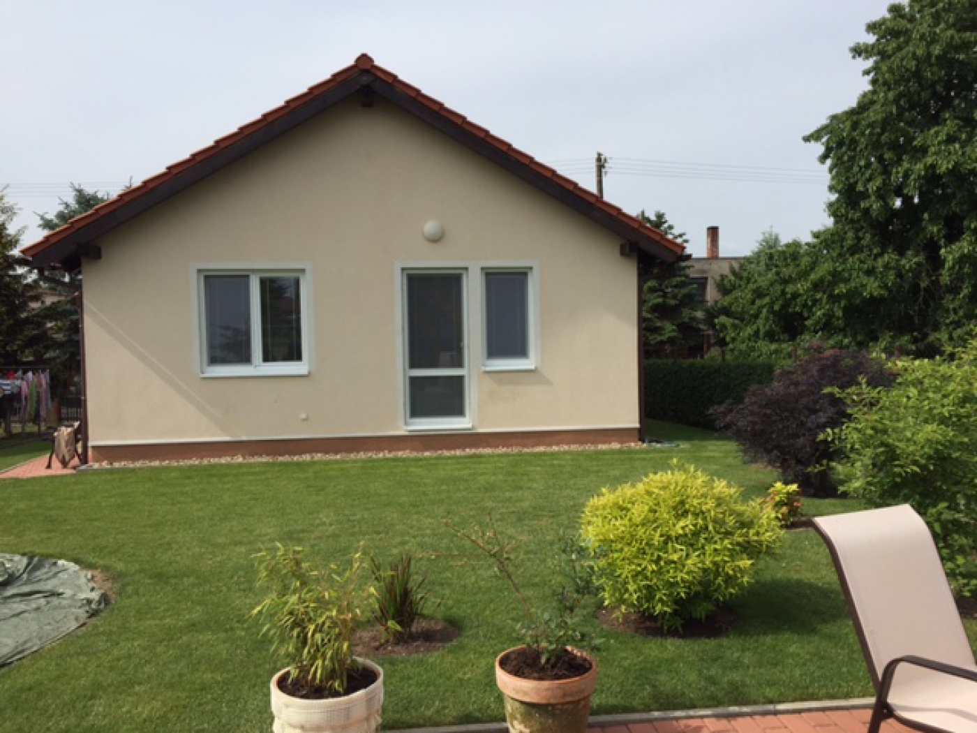 Malá dřevostavba, která vyrostla na zahradě rodného domu majitelky. Zákaznice zdědila po svých rodičích velký zděný dům s velikou zahradou. Zákaznice je v důchodovém věku, bylo by pro ni náročné se o tak finančně i technicky náročný dům sama starat, rozhodla se tedy rodný dům prodat a část pozemku si oddělit a ponechat pro výstavbu malého, energeticky nenáročného bungalovu, kdy péči o něj zvládá bez starostí a sama. Radost jí pak dělá malá okrasná zahrada o velikosti 400 m2.