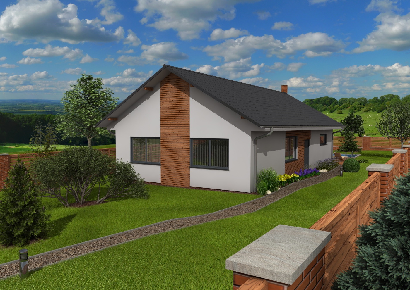 Pohodlná dřevostavba pro mladou rodinu s malými dětmi. Z obývací části domu je výhled do zahrady se vzrostlými jehličnatými stromy, za kterými vyčnívá hora Říp. Pýchou majitelky jsou velkolepé levandulové záhony, které lemují přístupovou cestu k domu a pýchou majitele je malé jezírko s rybami, k jejichž výlovu jsme každoročně přizvání :)