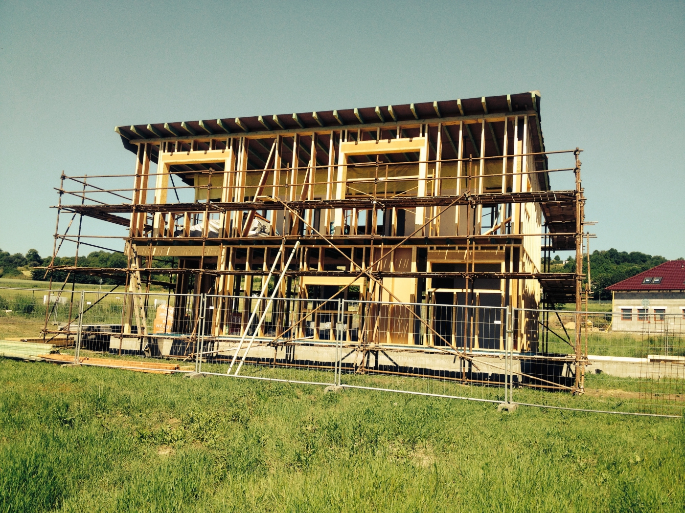 Dvoupatrová dřevostavba v moderním stylu má atypický vzhled a na konstrukční řešení náročný prosklený roh do hlavní obývací části. Zákazníci si potrpí na čistý a jednoduchý design. Objednávalo se např. kovové schodiště na míru, které tvoří jeden z výrazných prvků prvního podlaží. Moderní vzhled dřevostavby zvenku určuje pultová střecha. Dřevostavba má fasádu v kombinaci s dřevoobkladem. Na dřevostavbu pak navazuje prostorná garáž, kterou si zákazníci přáli zároveň používat jako malou dílnu, část garáže je tedy oddělená zateplená a je do ní přivedena voda.
